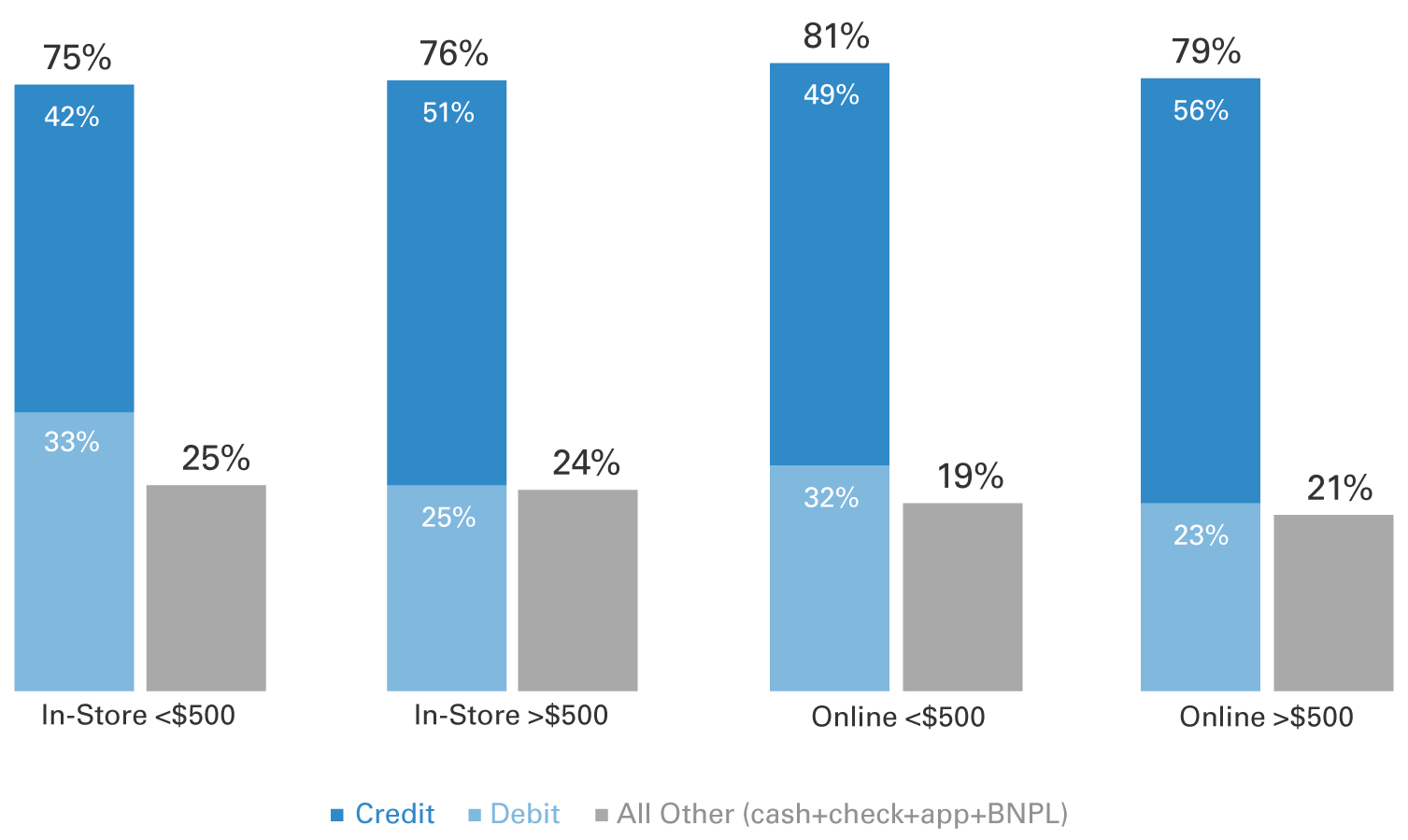 Gen Z prefers debit for large purchases – 46% in-store and 49% online, compared to 25% and 23% overall.