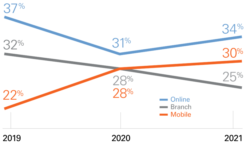 More people prefer mobile and online over in-person methods for interacting with their primary financial organizations. A majority would stay with a bank that went all digital.